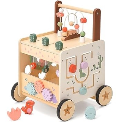 Wooden Baby Walker,6 in 1 Dinosaur Play Walker Adjustable Speed Push Cart with Brake & Shape Sorter,Natural Solid Wood Activity