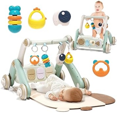 2 in 1 Baby Gym with Walker,Baby Play Mat with 4 Infant Learning Sensory,Double-Sided Multifunctional Removable Play Piano