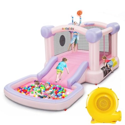 Bounce House, Pastel Bouncer with Slide, Pink Inflatable Jumping Bouncy Castle for Kids Birthday Party Gifts Outdoor & Indoor,