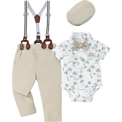 Baby Boy Clothes Suit 0-24M Infant Gentleman Wedding Outfit, Shirt+Bowtie+Beret+Suspender Pants Clothing Set