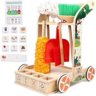 Wooden Baby Push and Pull Walker Kids Cleaning Cart Set for Toddlers Montessori Walker Cleaning Toys with Broom Mop Dustpan