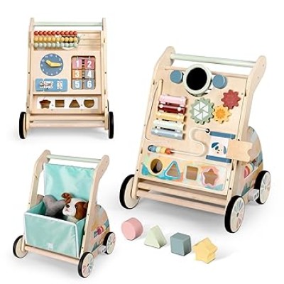Wooden Baby Walker, 3-in-1 Baby Push Walker, with Pretend Kitchen, Montessori Sensory Activity Center, Push Walker Toys for