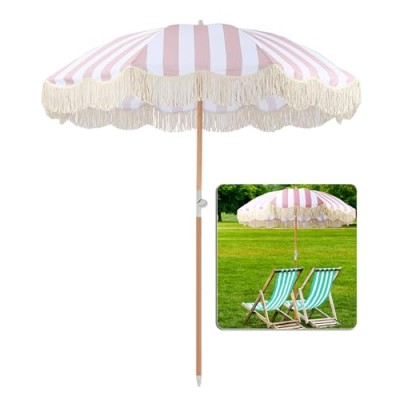 6.5FT Fringe Patio Parasol 8 Ribs Outdoor Beach Tassel Umbrella With Tilt & Carry Bag Yard Picnic Garden Lawn Deck Wedding Pool