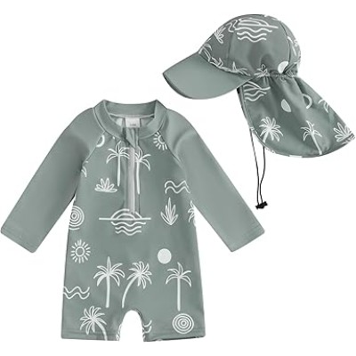 Toddler Baby Boy Girls One Piece Swimsuit Long Sleeve Zipper Bathing Suit with Hat Infant Rash Guard Swimwear
