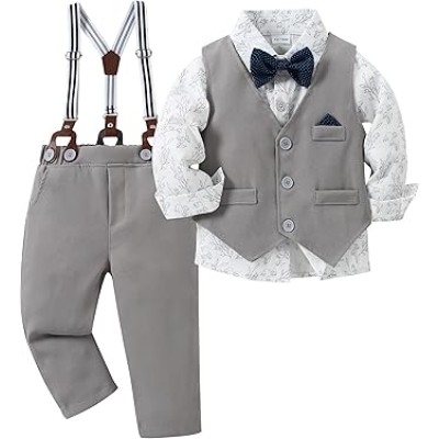 Toddler Baby Boy Clothes Suit 5Pcs Gentleman Wedding Outfit Dress Shirt+Vest+Bow Tie+Suspender Pant Formal Set 12M-5T